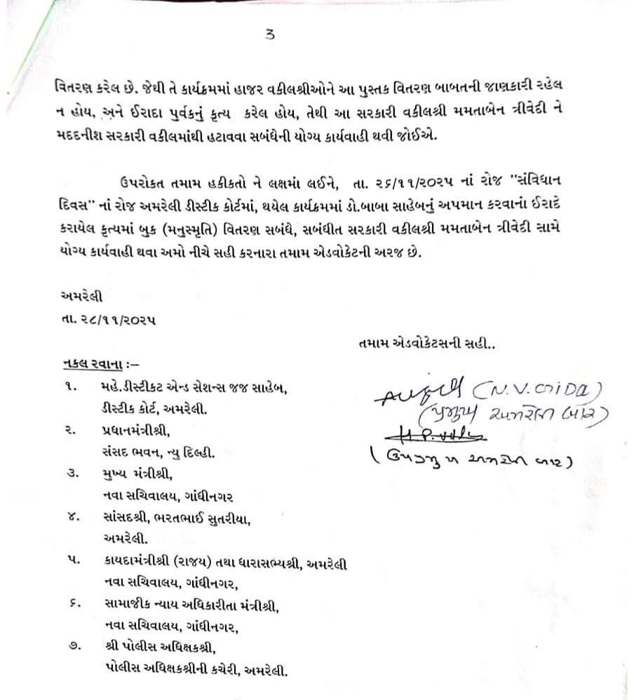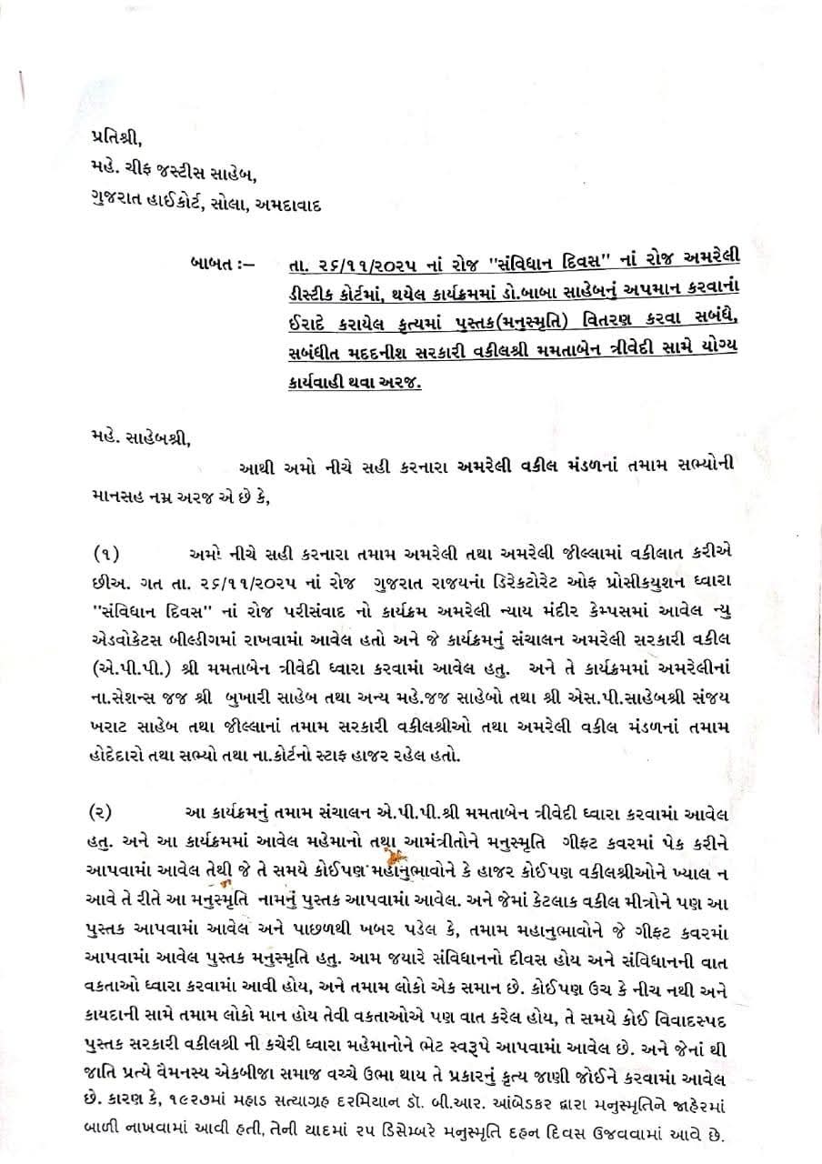 અમરેલી કોર્ટ પરિસરમાં આયોજિત બંધારણ દિવસની ઉજવણીનાં પરિસંવાદમાં સરકારી વકીલ મમતા ત્રિવેદીએ ઉપસ્થિત મહેમાનોને મનુસ્મૃતિ ભેટમાં આપતા ચકચાર મચી ગઈ છે. આ પરિવસંવાદમાં અમરેલી જિલ્લા સેશન્સ જજ, અન્ય જજો, વકીલો તથા અમરેલી જિલ્લાનાં એસ.પી. પણ હાજર હતાં. બંધારણ દિવસની ઉજવણીનું સંચાલન મમતા ત્રિવેદીનાં હાથમાં હતું જેનો લાભ લઈને પોતાને અને પોતાના પૂર્વજોને ધર્મ, ધન અને સત્તાનાં ઉચ્ચ શિખરે મોખરે લઈ જનારી અને હજારો વરસોથી બહુજન વંચિતોનાં જીવતર બદતર કરનારી મનુસ્મૃતિ ભેટમાં આપવાનો કારસો રચ્યો હતો.