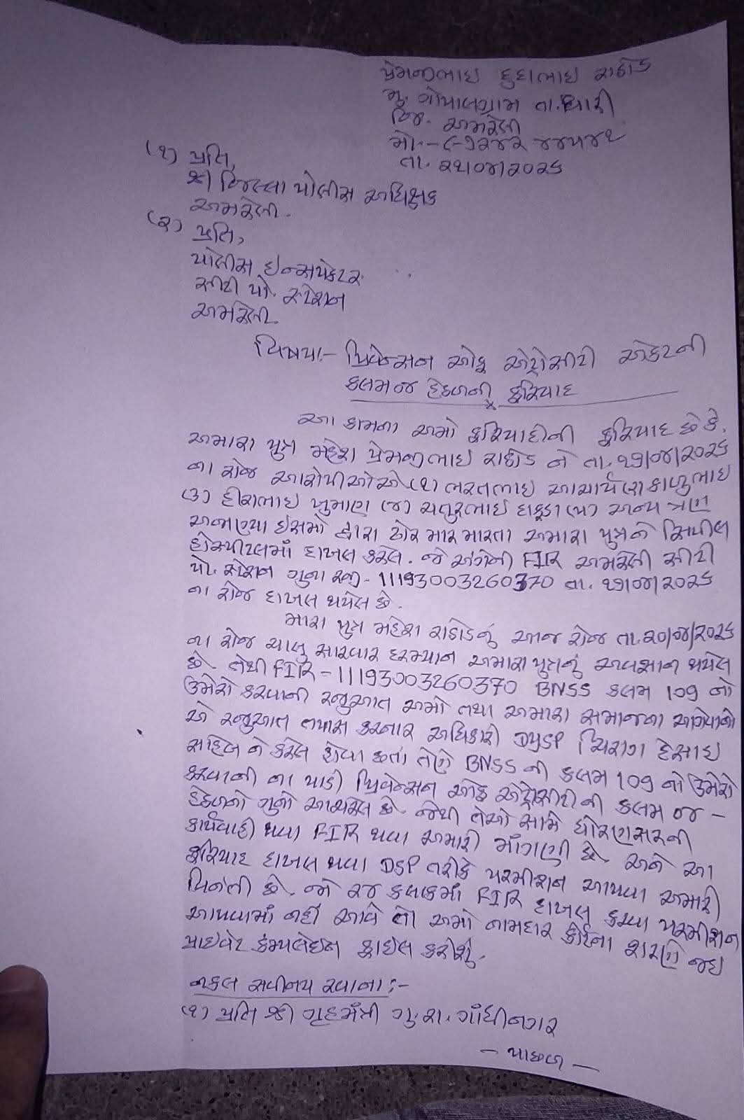 પુત્રની હત્યાથી ભાંગી પડેલા પિતા પ્રેમજીભાઈ દુદાભાઈ રાઠોડે આ મામલે અમરેલી શહેર પોલીસ સ્ટેશનમાં ફરિયાદ નોંધાવી છે અને તંત્ર સામે ગંભીર સવાલો ઉઠાવ્યા છે. પરિવારે લેખિત રજૂઆતમાં માંગ કરી છે કે હાલની એફ.આઈ.આરમાં હત્યા સંબંધિત BNSની કલમ 103(1) તથા એટ્રોસિટી એક્ટની કલમ 3(2)(5) નો તાત્કાલિક ઉમેરો કરવામાં આવે.