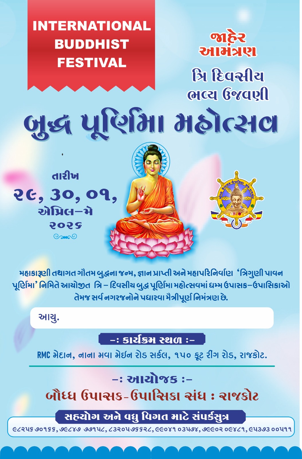 રાજકોટ: મહાકારુણિક તથાગત ગૌતમ બુદ્ધના જન્મ, જ્ઞાન પ્રાપ્તિ અને મહાપરિનિર્વાણના પવિત્ર અવસર ‘વૈશાખી પૂર્ણિમા’ને વિશ્વભરમાં ઉજવવામાં આવે છે. આ અંતર્ગત રાજકોટમાં બૌદ્ધ ઉપાસક-ઉપાસિકા સંઘ દ્વારા ‘ઇન્ટરનેશનલ બુદ્ધિસ્ટ ફેસ્ટિવલ’નું ત્રિ-દિવસીય આયોજન કરવામાં આવ્યું છે. નાના મવા મેઈન રોડ સર્કલ, 150 ફૂટ રિંગ રોડ સ્થિત RMC મેદાન ખાતે આ ઉત્સવ 29 એપ્રિલ 2026થી 1 મે 2026 દરમિયાન યોજાશે.